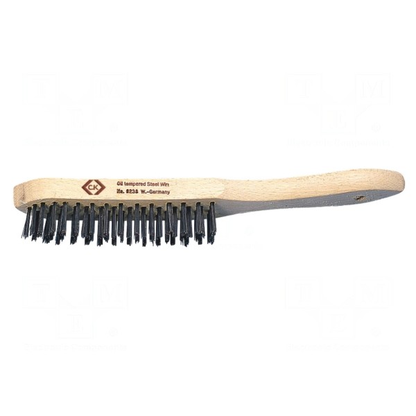 Szczotka druciana wyposażona w cztery rzędy drutu przeznaczona do prac oczyszczających. Produkt posiada korpus wykonany z drewna, co zapewnia pewny chwyt podczas użytkowania.
