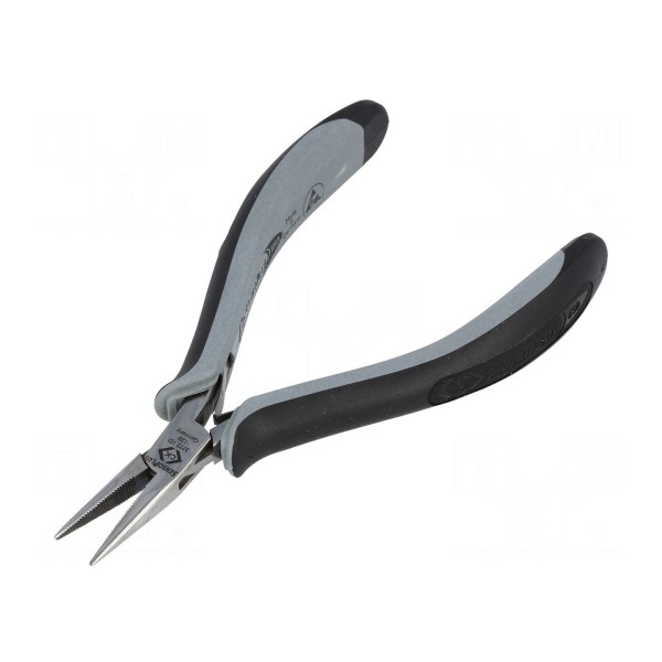 Szczypce półokrągłe o konstrukcji prostej wyposażone są w poprzecznie żłobkowane powierzchnie chwytające, co poprawia pewność uchwytu. Narzędzie wykonano w wersji ESD, dzięki czemu jest przystosowane do pracy w środowiskach wymagających ochrony przed wyładowaniami elektrostatycznymi. Całość charakteryzuje się niklowaną powłoką oraz ostrzami poddanymi procesowi hartowania.