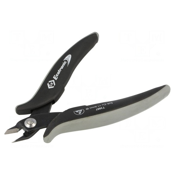 Miniaturowe szczypce tnące C.K T3887 przeznaczone są do precyzyjnych prac wymagających ochrony ESD. Narzędzie o długości 136 mm wyposażone jest w ostrza hartowane umożliwiające cięcie drutu miedzianego o maksymalnej średnicy 1,6 mm. Konstrukcja typu bez fazy zapewnia gładkie i równe krawędzie cięcia, co jest istotne w pracach montażowych elektroniki.