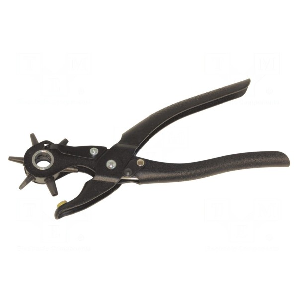 Szczypce obrotowe służą do wycinania otworów w różnorodnych materiałach, takich jak skóra, tkanina oraz tworzywa sztuczne. Narzędzie zostało wykonane ze stali, co zapewnia odpowiednią wytrzymałość podczas pracy.