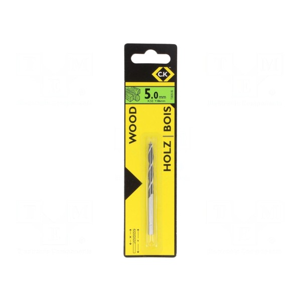 Wiertło przeznaczone do obróbki drewna o średnicy 5 mm. Narzędzie zostało wykonane ze stali chromowo-wanadowej, co zapewnia parametry wytrzymałościowe podczas pracy z materiałami drewnianymi.
