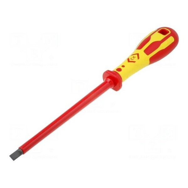 Izolowany wkrętak płaski o rozmiarze grota 8x1,2 mm przeznaczony jest do prac elektrycznych pod napięciem do 1kV AC oraz 1,5kV DC. Ostrze narzędzia wykonano ze stali, poddano procesowi hartowania oraz wyposażono w czernioną końcówkę, co wpływa na jego trwałość. Całkowita długość wkrętaka wynosi 295 mm, przy długości roboczej ostrza 175 mm.