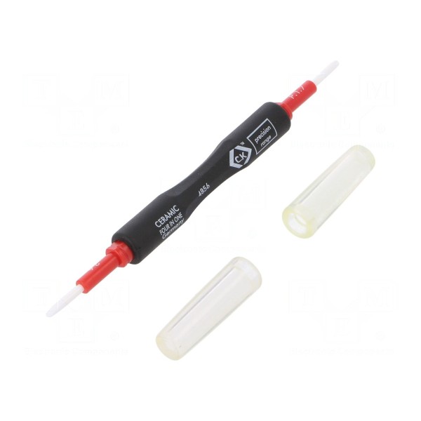Wkrętak precyzyjny C.K T4856A, znany również jako stroik, to narzędzie wyposażone w wymienne groty o różnych profilach i rozmiarach, w tym Phillips PH0 oraz płaskie o wymiarach 0,9mm, 1,8mm i 2,6mm. Całkowita długość narzędzia wynosi 155mm.
