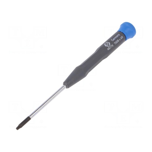Wkrętak precyzyjny wyposażony w grot typu Torx w rozmiarze TX08. Konstrukcja narzędzia oparta jest na ostrzu o długości 60 mm, wykonanym ze stali chromowo-wanadowo-molibdenowej, co zapewnia odpowiednią charakterystykę materiałową podczas pracy z niewielkimi elementami złącznymi.