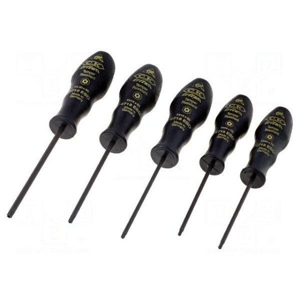 Zestaw składa się z pięciu precyzyjnych wkrętaków wyposażonych w groty typu Torx z zabezpieczeniem. W skład kompletu wchodzą rozmiary T8H, T9H, T10H, T15H oraz T20H.
