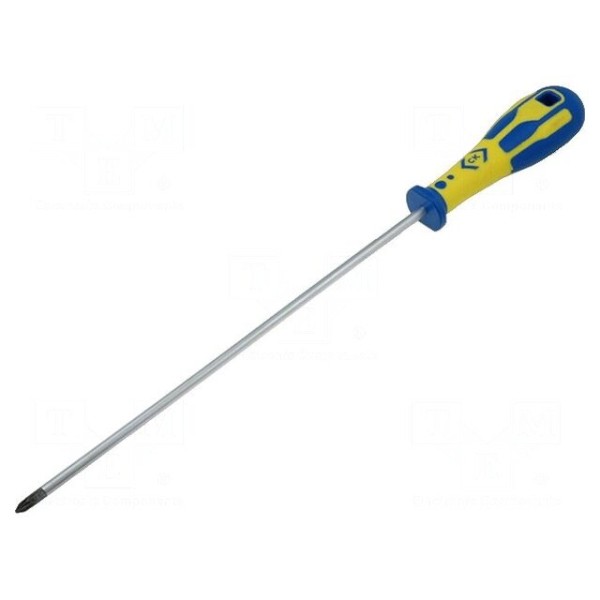 Wkrętak standardowy wyposażony w grot typu Pozidriv w rozmiarze PZ1. Ostrze wykonane ze stali charakteryzuje się chromowaną powierzchnią, hartowaną strukturą oraz czernioną końcówką. Konstrukcja narzędzia obejmuje wydłużone ostrze o długości 250mm, co pozwala na pracę w miejscach o utrudnionym dostępie.