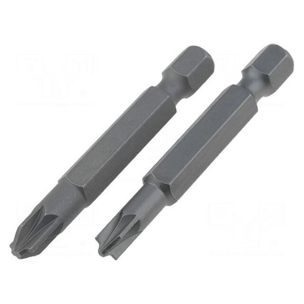 Zestaw zawiera dwie końcówki wkrętakowe typu MOD, PlusMinus PZ o długości całkowitej 50 mm. Elementy zostały wykonane ze stali i przeznaczone są do montażu w uchwytach z gniazdem 1/4", wykorzystując standard mocowania E6,3 mm.
