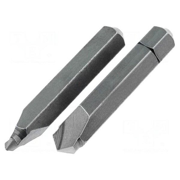 Zestaw zawiera dwie końcówki wkrętakowe o długości całkowitej 35 mm, wyposażone w uchwyt typu C6,3 mm. Elementy wykonano ze stali, co zapewnia ich trwałość podczas pracy z różnymi rodzajami wkrętów.