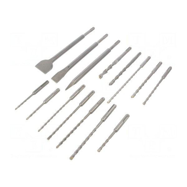 W skład zestawu wchodzą wiertła o zróżnicowanych wymiarach średnicy i długości, w tym: 5x160mm, 5,5x110mm, 5,5x160mm, 6x110mm, 6x160mm, 6x210mm, 6,5x160mm, 7x160mm, 8x160mm, 10x160mm oraz 12x160mm. W zestawie: dłuto x3.
