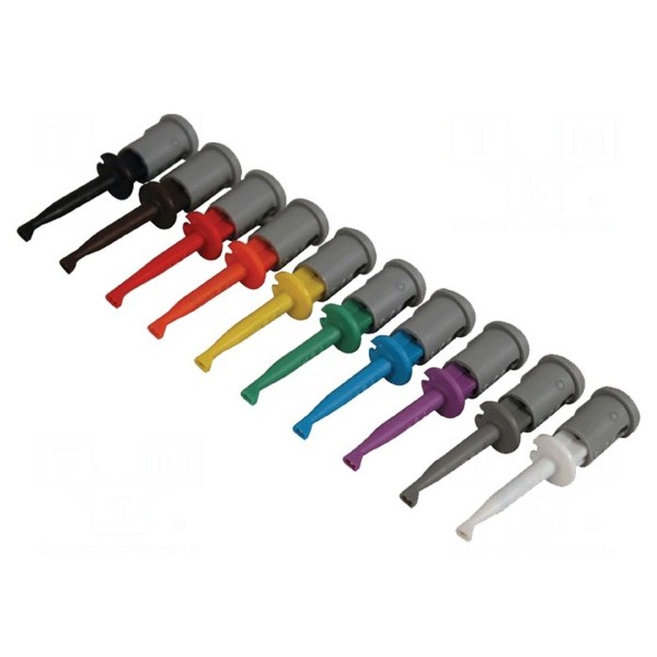 Zestaw zawiera dziesięć chwytaków pomiarowych typu haczykowego. Elementy te są przeznaczone do pracy przy maksymalnym prądzie znamionowym 6A oraz napięciu znamionowym 70V DC lub 33V AC.