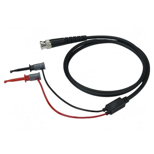Przewód pomiarowy o impedancji 50Ω charakteryzuje się prądem znamionowym 3A oraz napięciem znamionowym 0,5kV. Konstrukcja elementu obejmuje wtyk BNC oraz dwa chwytaki haczykowe. Izolacja przewodu wykonana została z materiału PVC. Akcesorium przeznaczone jest do prac pomiarowych wymagających stabilnego połączenia w standardzie BNC.