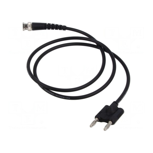Przewód pomiarowy o długości 1m wykorzystuje kabel typu RG58CU oraz izolację wykonaną z polipropylenu. Konstrukcja elementu obejmuje wtyk BNC oraz podwójny wtyk bananowy 4mm, a całość została wykończona w kolorze czarnym.