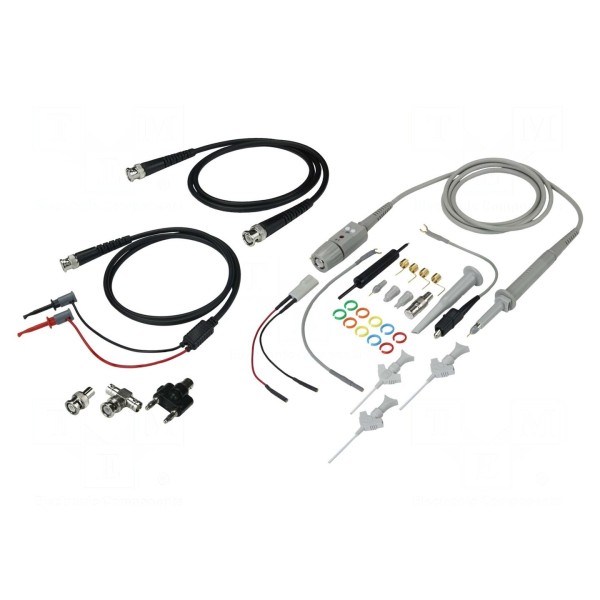 W zestawie: adaptery, chwytaki pomiarowe (2 szt.), kabel BNC (2 szt.), sonda oscyloskopowa.