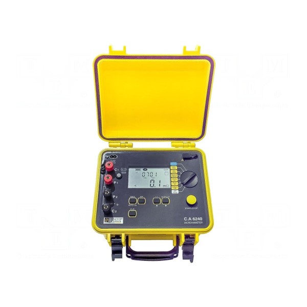 Miliomomierz CHAUVIN ARNOUX C.A 6240 służy do precyzyjnych pomiarów rezystancji w zakresie od 400µΩ do 400Ω. Przyrząd charakteryzuje się dokładnością pomiarową na poziomie ±(0,25%+2 cyfry) i został wyposażony w czytelny wyświetlacz LCD. Urządzenie obsługuje różne wartości prądu pomiarowego, od 10mA dla wyższych zakresów rezystancji, aż do 10A przy najniższych zakresach od 5µΩ do 3,999µΩ.