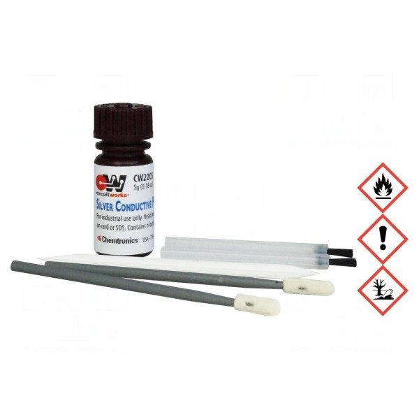 Lakier przewodzący CHEMTRONICS CW2205 to preparat w kolorze srebrnym przeznaczony do rysowania ścieżek przewodzących. Produkt znajduje zastosowanie w pracach serwisowych oraz naprawczych wymagających odtworzenia lub wykonania połączeń elektrycznych na płytkach drukowanych.