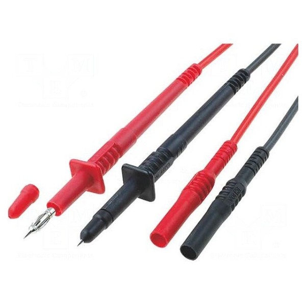Zestaw zawiera przewody pomiarowe o długości 1,35 m oraz przekroju żyły 0,75 mm². Przewody zostały wykonane w izolacji silikonowej, co zapewnia elastyczność podczas eksploatacji. Wyposażone są w końcówki pomiarowe oraz wtyki bananowe o średnicy 4 mm.