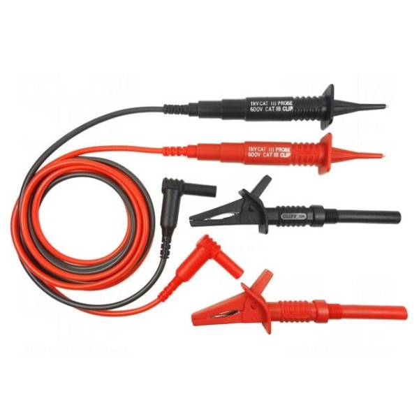 Konstrukcja zestawu obejmuje dwa przewody zakończone kątowym wtykiem bananowym 4 mm oraz końcówką pomiarową. W skład kompletu wchodzą również dwa krokodylki, co umożliwia rozszerzenie zakresu zastosowań pomiarowych. Produkt spełnia wymagania norm EN 61010 oraz posiada kategorię bezpieczeństwa CAT II 1000V i CAT III 600V.