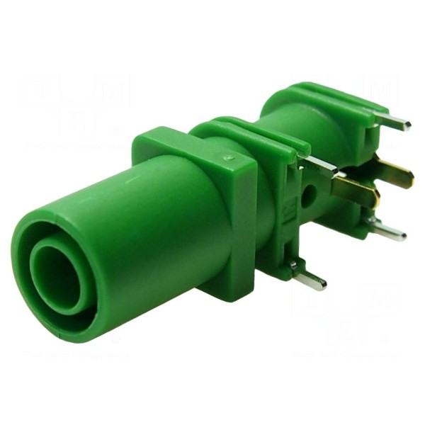 Złącze laboratoryjne typu gniazdo bananowe 4mm przeznaczone jest do montażu na obwodach drukowanych PCB poprzez lutowanie. Element charakteryzuje się napięciem znamionowym 1kV DC oraz prądem znamionowym wynoszącym 10A. Konstrukcja złącza o długości 33mm posiada złocone pokrycie styków, co wpływa na parametry połączeniowe.