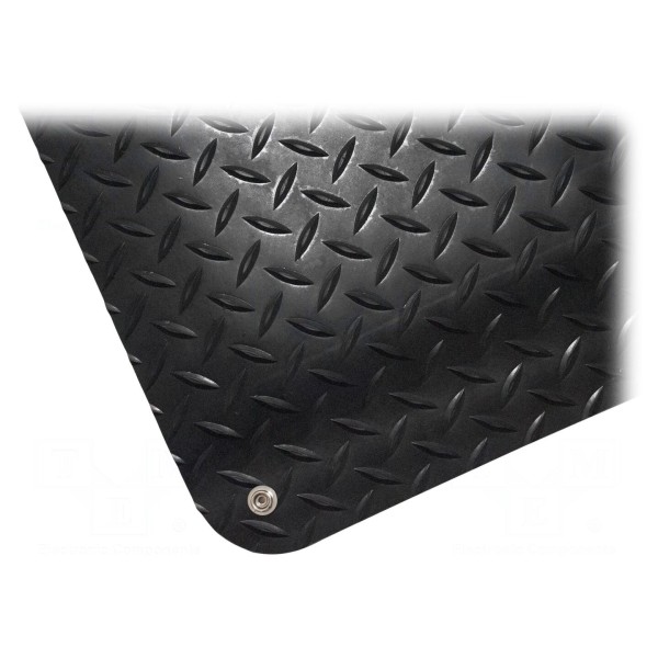 Element o wymiarach 0,9m długości oraz 0,6m szerokości posiada grubość 14mm. Konstrukcja maty została wyposażona w dwa zatrzaski męskie 10mm, umożliwiające podłączenie akcesoriów uziemiających. Czarna powierzchnia wyrobu wspiera utrzymanie parametrów ESD w środowisku pracy.