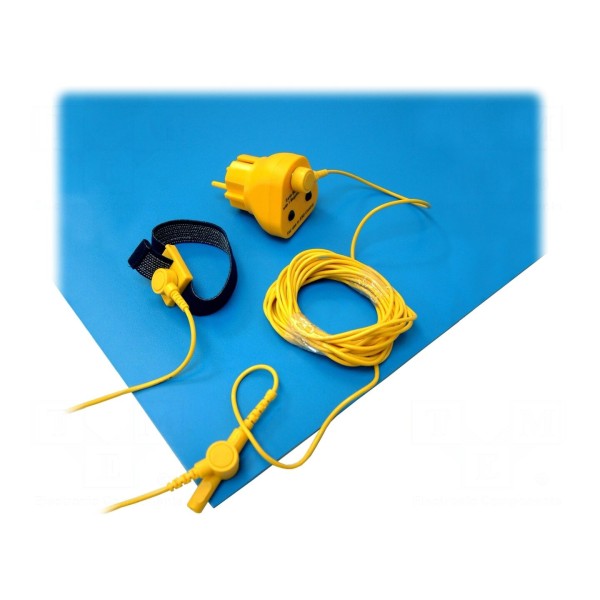 Wymiary użytkowe maty wynoszą 1,2m długości oraz 0,6m szerokości przy grubości 3,2mm. Produkt w kolorze niebieskim został wyposażony w zatrzask męski o średnicy 10mm umożliwiający podłączenie układu uziemiającego. W zestawie: mata antystatyczna, opaska ESD, przewód uziemiający, wtyk uziemiający.