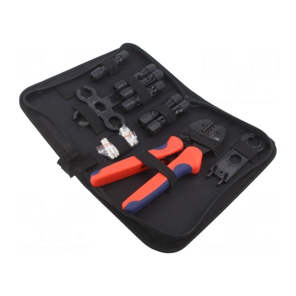 W zestawie: klucz, zaciskarka, złącza solarne MC4. Całość przechowywana jest w praktycznym etui, które ułatwia transport oraz porządkowanie narzędzi w miejscu wykonywania prac.