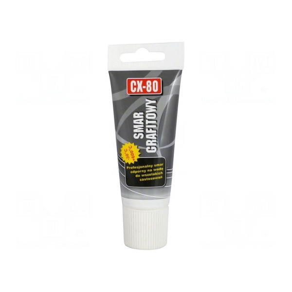 Smar CX-80 SMAR GRAFITOWY to preparat w formie czarnej pasty, którego głównym składnikiem jest grafit. Produkt przeznaczony jest do smarowania oraz ochrony przed korozją w szerokim zakresie temperatur roboczych, wynoszącym od -30°C do 600°C.