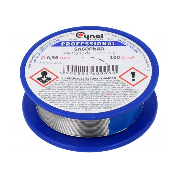 Drut lutowniczy wykonany ze stopu Sn60Pb40 przeznaczony jest do lutowania miękkiego w przemyśle elektronicznym. Spoiwo o średnicy 0,56 mm wyposażone jest w trzy rdzenie topnika SW26, który charakteryzuje się składem halogenkowym, kalafoniowym oraz typem No Clean ROL1. Zawartość topnika w drucie wynosi 2,5%, co zapewnia efektywne zwilżanie powierzchni podczas procesu lutowania.