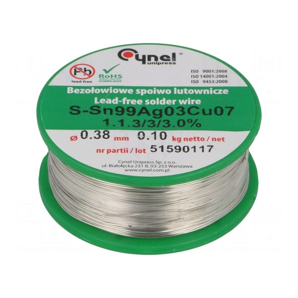 Bezołowiowy drut lutowniczy o składzie stopu Sn99Cu0,7Ag0,3 przeznaczony do lutowania miękkiego. Produkt charakteryzuje się średnicą 0,38 mm i jest oferowany na szpuli o masie 100 g. Temperatura topnienia spoiwa mieści się w zakresie 216...227°C, przy gęstości wynoszącej 7,44 g/cm³.