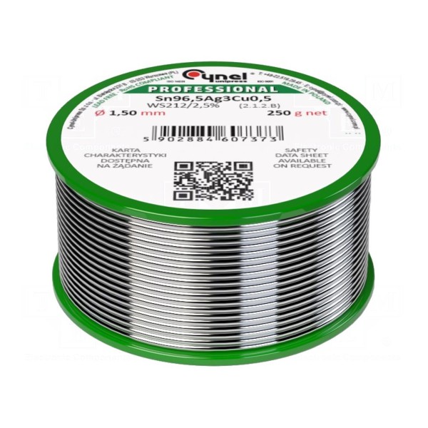 Bezołowiowy drut lutowniczy CYNEL SN96,5AG3CU0,5-WS212/2,5%1.50 250 G składa się ze stopu Sn96,5Ag3Cu0,5 o średnicy 1,5 mm. Produkt znajduje zastosowanie w przemyśle elektronicznym i jest przeznaczony do lutowania miękkiego.