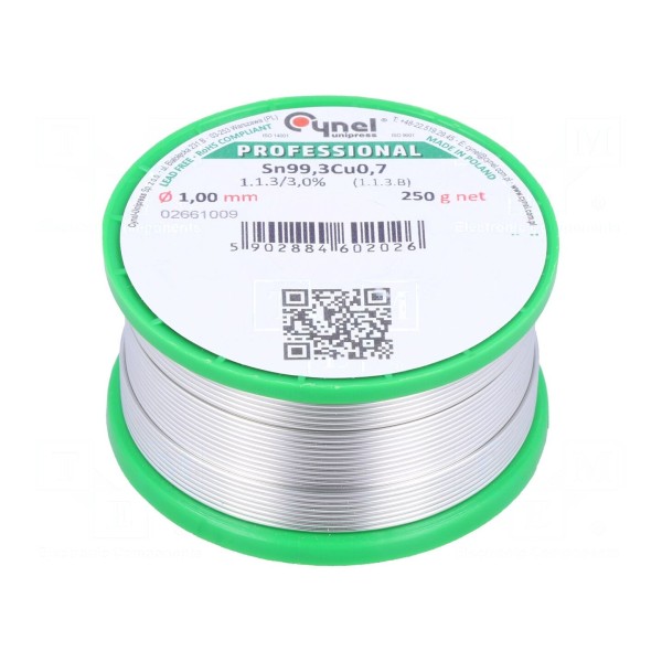 Bezołowiowy drut lutowniczy wykonany ze stopu Sn99,3Cu0,7, przeznaczony do procesów lutowania miękkiego. Spoiwo charakteryzuje się temperaturą topnienia wynoszącą 227°C i jest dostarczane w formie nawiniętej na szpuli o masie 250g.