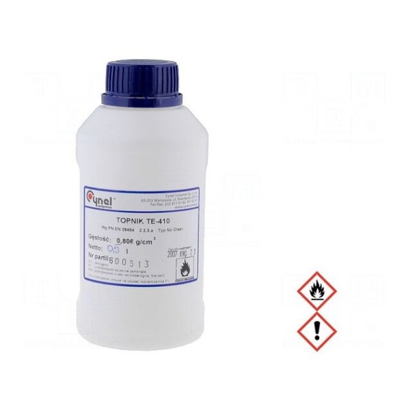 Topnik CYNEL TE410/500 to preparat w formie płynnej, przeznaczony do procesów lutowania. Produkt charakteryzuje się składem bezkalafoniowym oraz bezhalogenkowym, klasyfikowanym jako No Clean. Zawartość ciał stałych w preparacie mieści się w zakresie od 0 do 3%.