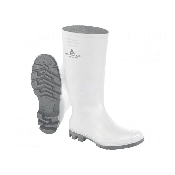 Wysokie kalosze wykonane z tworzywa PVC przeznaczone do użytkowania w służbie zdrowia. Obuwie charakteryzuje się odpornością na poślizg oraz zmienne warunki atmosferyczne.