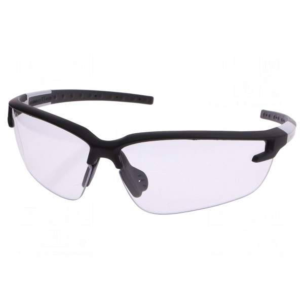 Okulary ochronne wyposażone są w soczewki poliwęglanowe o klasie optycznej 1, co zapewnia wysoką przejrzystość obrazu. Konstrukcja soczewek gwarantuje odporność na uderzenia, a dodatkowe właściwości obejmują ochronę przed promieniowaniem UV na poziomie UV400.