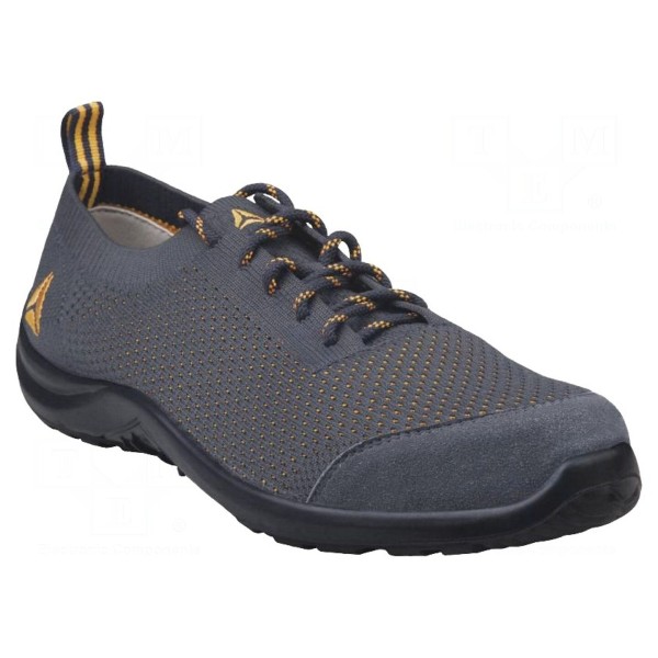 Półbuty wykonane z połączenia bawełny i poliestru w kolorze szaro-pomarańczowym są przeznaczone do ochrony stóp w środowisku pracy. Model w rozmiarze 48 został wyposażony w metalowy podnosek, który zapewnia zabezpieczenie przed uderzeniami.