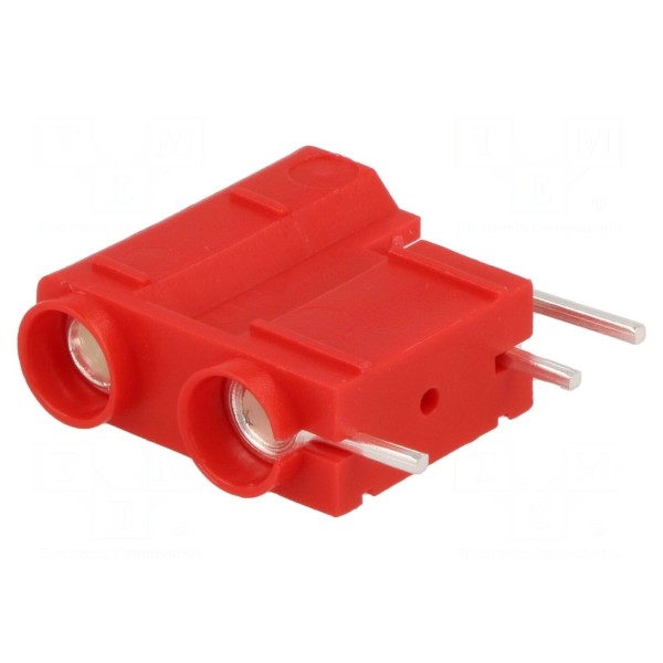 Złącze bananowe 4mm w wersji izolowanej, podwójnej, przeznaczone do montażu na płytkach drukowanych (PCB). Element posiada styki wykonane z mosiądzu z powłoką srebrzoną, co zapewnia rezystancję styku na poziomie maksymalnie 10mΩ.