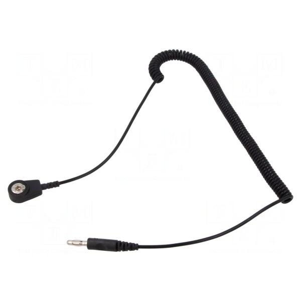 Produkt wyposażony jest w końcówki typu wtyk bananowy 4mm oraz zatrzask żeński 4mm. Przewód utrzymany jest w czarnej kolorystyce i przystosowany do pracy w środowiskach wymagających kontrolowanego odprowadzania ładunków elektrostatycznych.