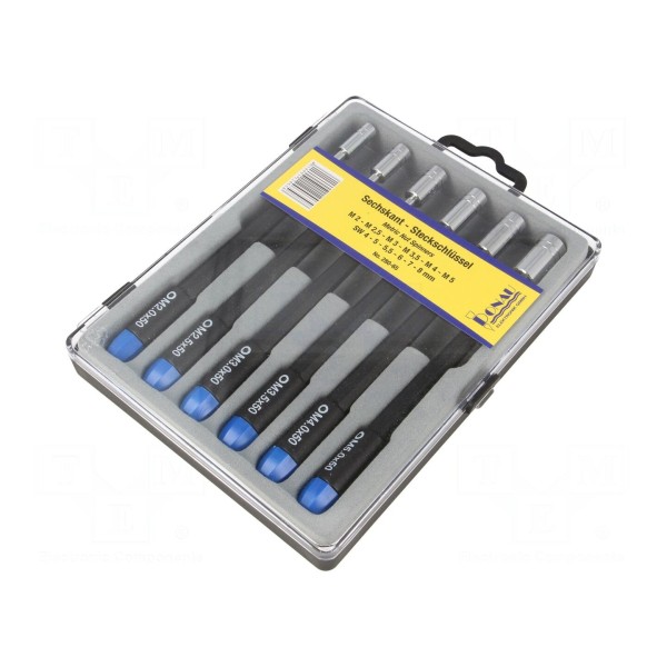 Zestaw obejmuje 6 wkrętaków precyzyjnych wyposażonych w końcówki typu nasadka 6-kątna. Narzędzia przeznaczone są do pracy z elementami złącznymi o zróżnicowanych wymiarach.