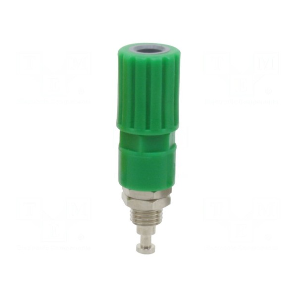 Komponent charakteryzuje się prądem znamionowym wynoszącym 36A. Do instalacji gniazda w obudowie lub panelu wymagany jest otwór montażowy o średnicy 8mm. Produkt dostępny jest w kolorze zielonym.