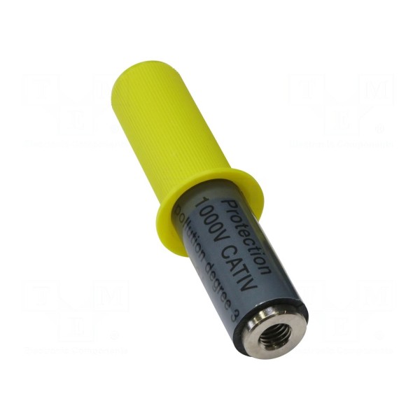 Konstrukcja akcesorium obejmuje gniazdo bananowe 4mm oraz gniazdo żeńskie M8, zapewniając stabilne połączenie w układach pomiarowych. Element wykonany został z niklowanymi stykami w kolorze czarnym i jest zgodny z normą bezpieczeństwa CAT IV 1000V.