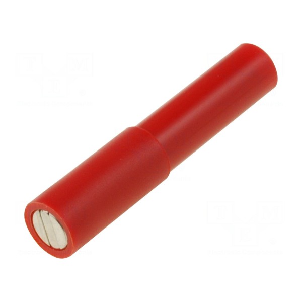 Parametry elektryczne komponentu pozwalają na pracę przy prądzie znamionowym do 12A oraz napięciu znamionowym wynoszącym 30V AC lub 60V DC. Produkt utrzymany jest w czerwonej kolorystyce, a jego całkowita długość wynosi 35mm.