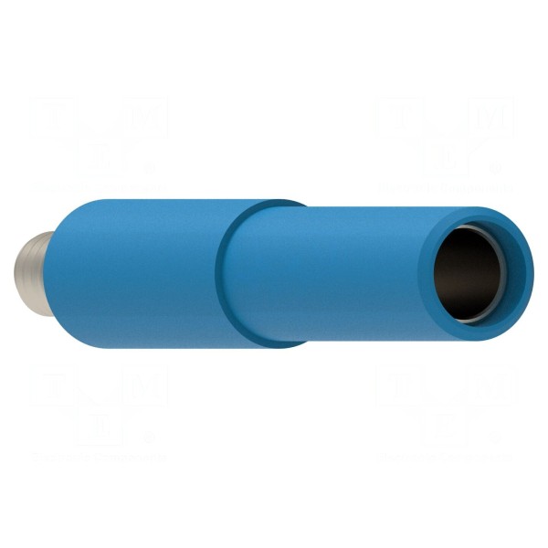Styk adaptera został pokryty warstwą niklu, co wpływa na parametry połączenia. Długość gwintu wynosi 6 mm, a korpus elementu wyróżnia się niebieskim kolorem ułatwiającym identyfikację w zestawach pomiarowych.