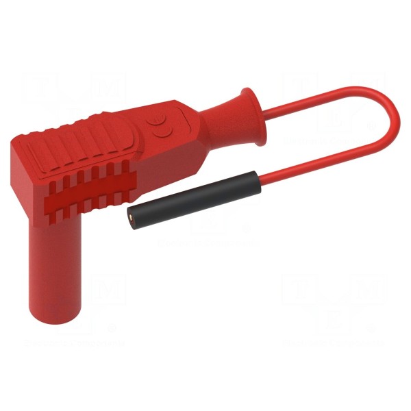 Konstrukcja przewodu obejmuje gniazdo 0,8 mm oraz kątowy wtyk bananowy 4 mm. Całość wykonana jest w kolorze czerwonym, co ułatwia identyfikację połączeń w instalacjach pomiarowych.
