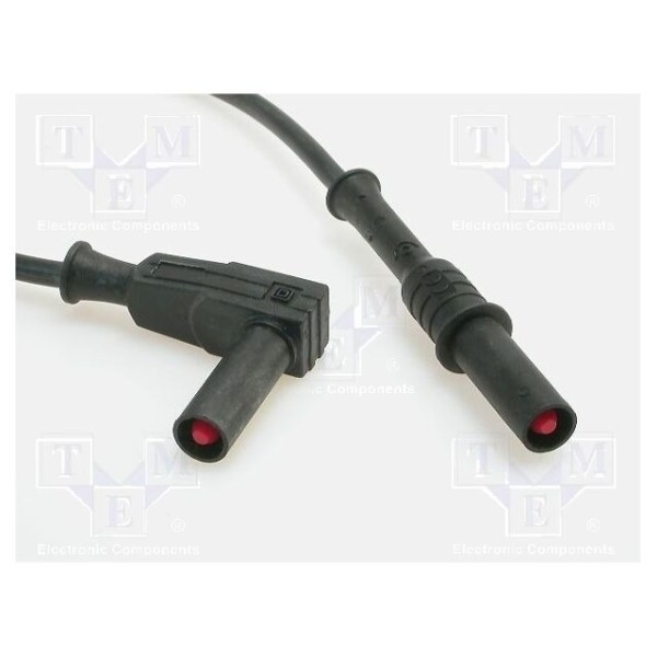Przewód pomiarowy o długości 1 metra został wyposażony w prosty oraz kątowy wtyk bananowy 4 mm z osłoną. Przekrój przewodu wynosi 1 mm², co umożliwia pracę przy prądzie znamionowym do 20 A.