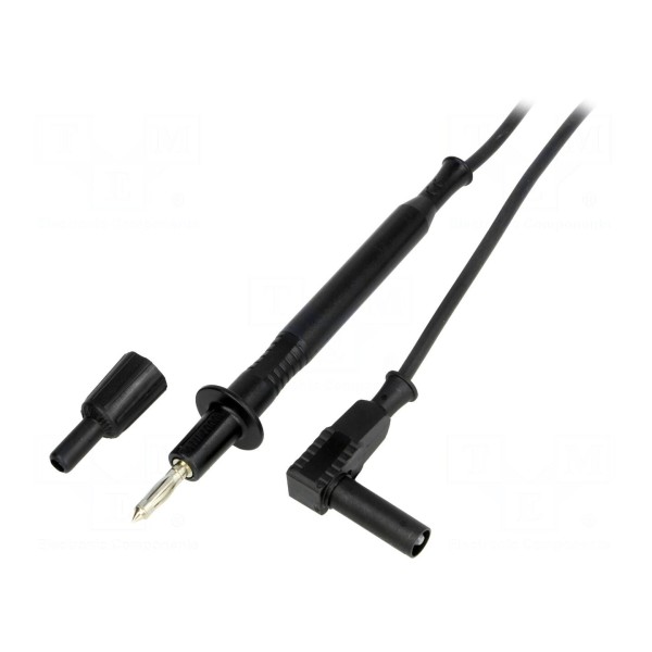 Zakończenie przewodu stanowią końcówka pomiarowa oraz wtyk bananowy 4 mm, przy czym obie strony wyposażono w osłony podnoszące poziom bezpieczeństwa. Akcesorium posiada nasadkę zapobiegającą zwarciom, a jego konstrukcja jest zgodna z normą EN 61010 oraz kategorią bezpieczeństwa CAT III 1000V. Element dostępny jest w kolorze czarnym.