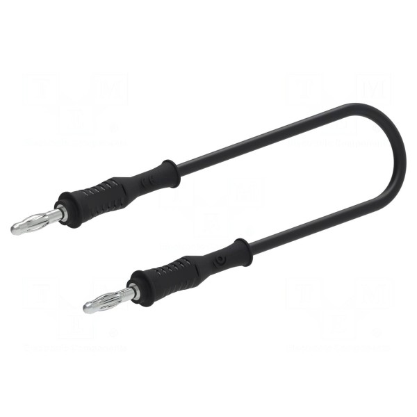 Przewód pomiarowy o długości 0,25 m został wyposażony w standardowe wtyki bananowe 4 mm znajdujące się po obu stronach kabla. Element ten charakteryzuje się prądem znamionowym wynoszącym 12 A oraz napięciem znamionowym 30 V AC i 60 V DC.