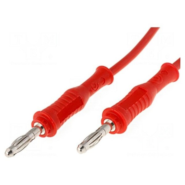 Przewód pomiarowy marki ELECTRO-PJP o długości 1 m wyposażony jest wtyki bananowe 4 mm umieszczone po obu stronach kabla. Element charakteryzuje się obciążalnością prądową na poziomie 20 A oraz przystosowaniem do pracy z napięciem znamionowym wynoszącym 33 V AC oraz 70 V DC.