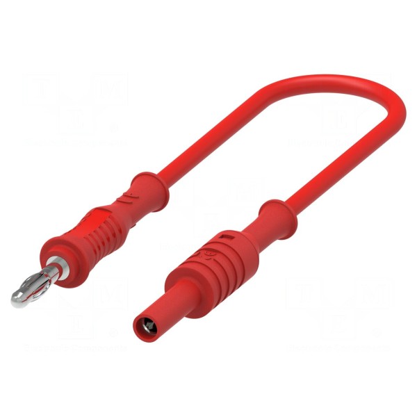 Przewód pomiarowy w kolorze czerwonym o długości 1 metra został zakończony gniazdem bananowym 4 mm oraz wtykiem bananowym 4 mm. Parametry techniczne pozwalają na pracę przy prądzie znamionowym wynoszącym 12 A oraz napięciu znamionowym 30 V AC lub 60 V DC.