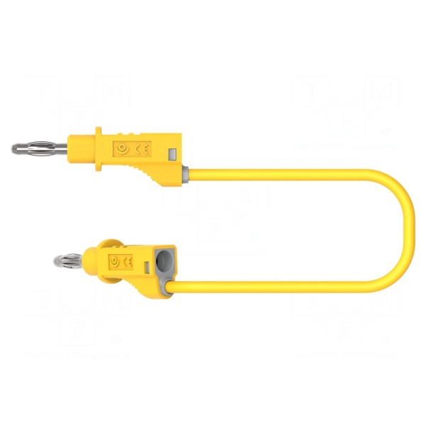 Przewód pomiarowy o długości 0,5 metra przeznaczony jest do pracy z napięciem znamionowym do 30V AC oraz 60V DC przy obciążeniu prądowym wynoszącym 12A. Konstrukcja elementu obejmuje wtyki bananowe 4mm umieszczone po obu stronach przewodu oraz złącze wyposażone w gniazdo osiowe 4mm.