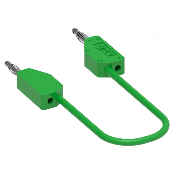 Konstrukcja przewodu obejmuje wtyki bananowe 2 mm umieszczone po obu stronach elementu. Całość utrzymana jest w zielonej kolorystyce, co ułatwia identyfikację połączeń w układach pomiarowych.