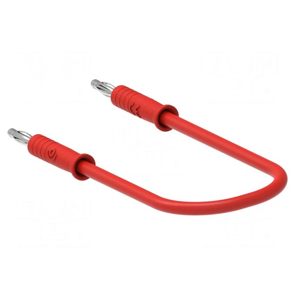 Konstrukcja przewodu obejmuje obustronne zakończenie wtykiem bananowym o średnicy 2 mm. Element występuje w kolorze czerwonym, co ułatwia identyfikację połączeń w instalacjach i układach pomiarowych.